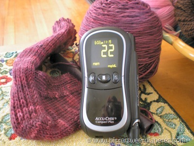 Today I am thankful that although I have diabetes, I have also been blessed with a really good tolerance for handling very low lows. Take, for instance, Friday night when I was home alone (okay, knitting) and was surprised by this, out of no where, on my meter.